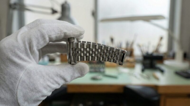 ガラスや内部機械は交換・修理が可能ですが、金属ブレスレットの「伸び」は、コマの連結部分が摩耗して隙間が広がっている状態であり、元に戻すことができないからです。