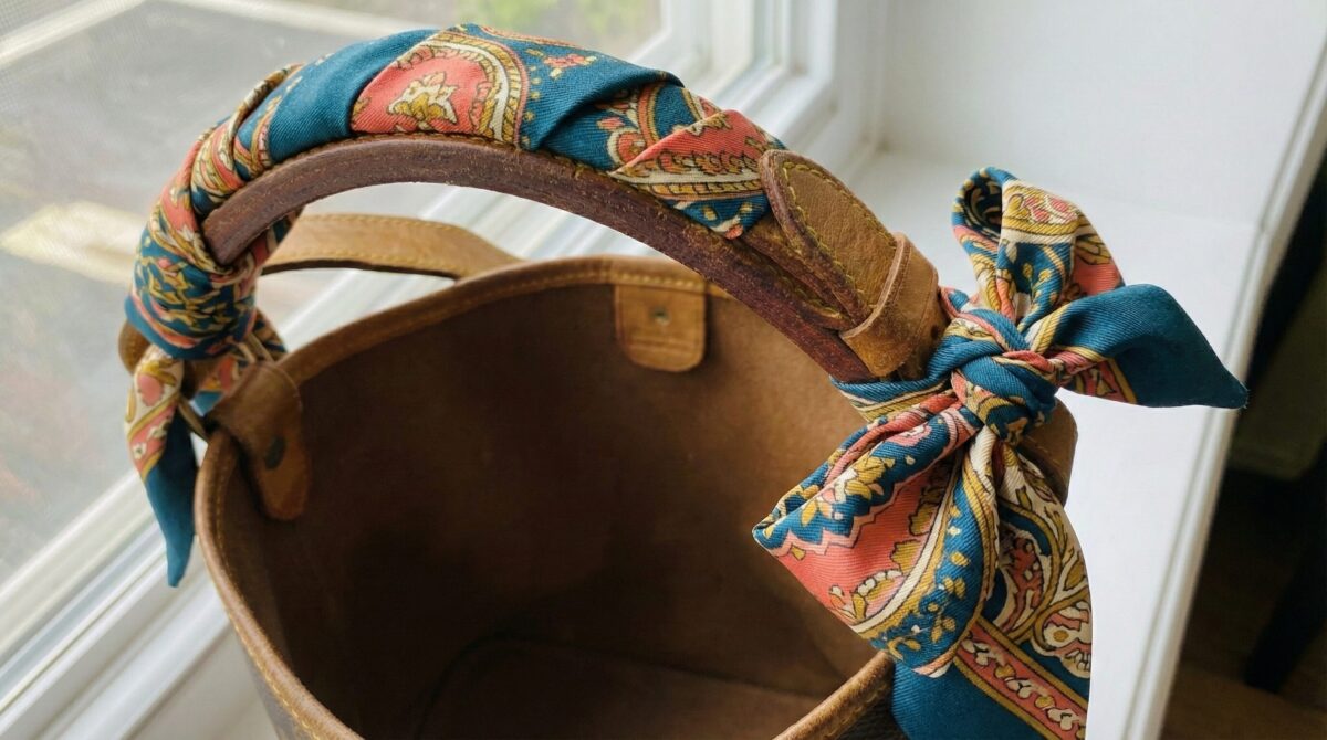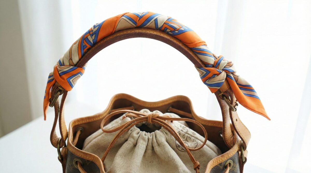 ヌメ革が飴色に変色しすぎている(黒ずんでいる)場合、それが「生活感」や「古さ」の原因になります。カラフルなスカーフでハンドルを隠すように巻けば、汚れをカバーしつつ、今っぽい華やかさをプラスできます。